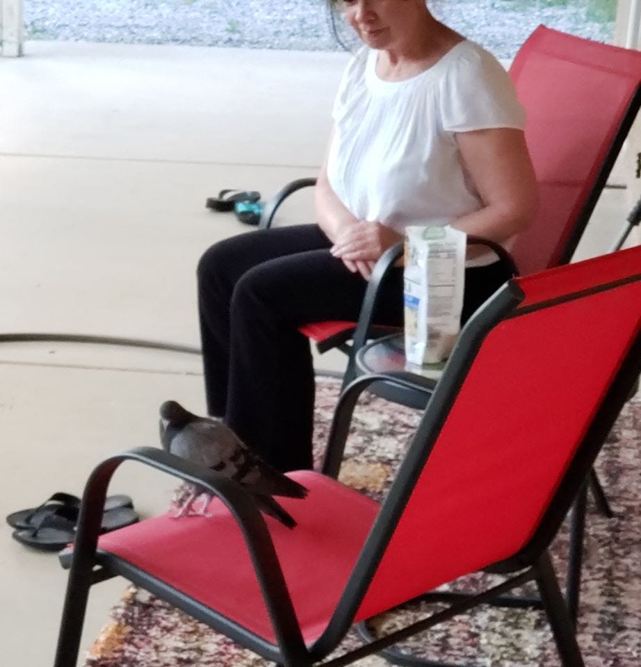 The following morning, I awoke at 6:15 and peeked out of my sliding door to check on Rocky. Would he still be there? Would there be merely a pile of lifeless feathers? To my astonishment, Rocky was sitting up in the chair with his eyes wide open. I was thrilled he decided to stay and was fit as a fiddle. I told Rocky I’d be back in 10 minutes and we’d visit some more. I was excited to have kind-hearted company!